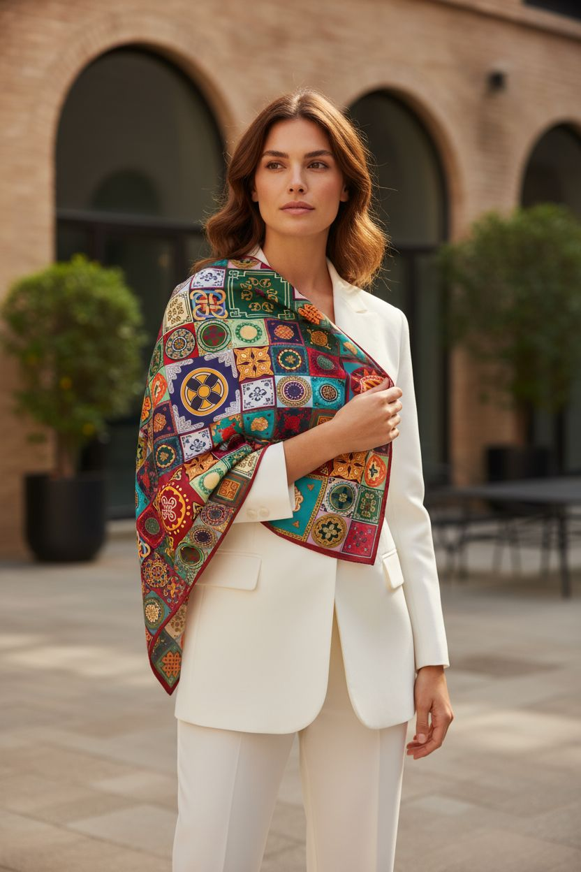 This unique silk scarf is inspired by the artistic legacy of an ancient land — a crossroads of cultures, colors, and stories that have shaped centuries of creativity.